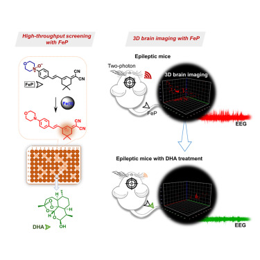 Imbalanced iron homeostasis plays a crucial role in neurological diseases, yet direct imaging evidence revealing the distribution of active ferrous iron (Fe2+) in the living brain remains scarce. Here, we present a near-infrared excited two-photon fluorescent probe (FeP) for imaging changes of Fe2+ flux in the living epileptic mouse brain. In vivo 3D two-photon brain imaging with FeP directly revealed abnormal elevation of Fe2+ in the epileptic mouse brain. Moreover, we found that dihydroartemisinin (DHA), a lead compound discovered through probe-based high-throughput screening, plays a critical role in modulating iron homeostasis. In addition, we revealed that DHA might exert its antiepileptic effects by modulating iron homeostasis in the brain and finally inhibiting ferroptosis. This work provides a reliable chemical tool for assessing the status of ferrous iron in the living epileptic mouse brain and may aid the rapid discovery of antiepileptic drug candidates.