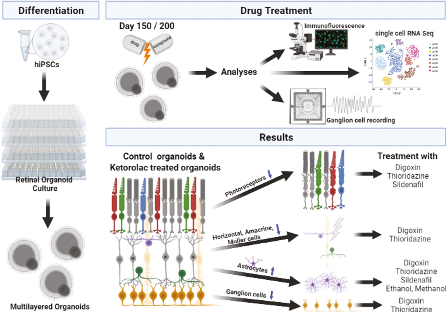Retinal drug toxicity screening is essential for the development of safe treatment strategies for a large number of diseases. To this end, retinal organoids derived from human pluripotent stem cells (hPSCs) provide a suitable screening platform due to their similarity to the human retina and the ease of generation in large-scale formats. In this study, two hPSC cell lines were differentiated to retinal organoids, which comprised all key retinal cell types in multiple nuclear and synaptic layers. Single-cell RNA-Seq of retinal organoids indicated the maintenance of retinal ganglion cells and development of bipolar cells: both cell types segregated into several subtypes. Ketorolac, digoxin, thioridazine, sildenafil, ethanol, and methanol were selected as key compounds to screen on retinal organoids because of their well-known retinal toxicity profile described in the literature. Exposure of the hPSC-derived retinal organoids to digoxin, thioridazine, and sildenafil resulted in photoreceptor cell death, while digoxin and thioridazine additionally affected all other cell types, including Müller glia cells. All drug treatments caused activation of astrocytes, indicated by dendrites sprouting into neuroepithelium. The ability to respond to light was preserved in organoids although the number of responsive retinal ganglion cells decreased after drug exposure. These data indicate similar drug effects in organoids to those reported in in vivo models and/or in humans, thus providing the first robust experimental evidence of their suitability for toxicological studies.