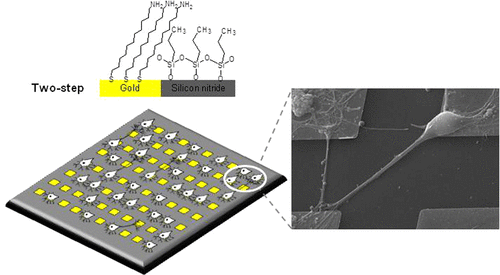 The control of neuron–substrate adhesion has been always a challenge for fabricating neuron-based cell chips and in particular for multielectrode array (MEA) devices, which warrants the investigation of the electrophysiological activity of neuronal networks. The recent introduction of high-density chips based on the complementary metal oxide semiconductor (CMOS) technology, integrating thousands of electrodes, improved the possibility to sense large networks and raised the challenge to develop newly adapted functionalization techniques to further increase neuron electrode localization to avoid the positioning of cells out of the recording area. Here, we present a simple and straightforward chemical functionalization method that leads to the precise and exclusive positioning of the neural cell bodies onto modified electrodes and inhibits, at the same time, cellular adhesion in the surrounding insulator areas. Different from other approaches, this technique does not require any adhesion molecule as well as complex patterning technique such as μ-contact printing. The functionalization was first optimized on gold (Au) and silicon nitride (Si3N4)-patterned surfaces. The procedure consisted of the introduction of a passivating layer of hydrophobic silane molecules (propyltriethoxysilane [PTES]) followed by a treatment of the Au surface using 11-amino-1-undecanethiol hydrochloride (AT). On model substrates, well-ordered neural networks and an optimal coupling between a single neuron and single micrometric functionalized Au surface were achieved. In addition, we presented the preliminary results of this functionalization method directly applied on a CMOS-MEA: the electrical spontaneous spiking and bursting activities of the network recorded for up to 4 weeks demonstrate an excellent and stable neural adhesion and functional behavior comparable with what expected using a standard adhesion factor, such as polylysine or laminin, thus demonstrating that this procedure can be considered a good starting point to develop alternatives to the traditional chip coatings to provide selective and specific neuron–substrate adhesion.